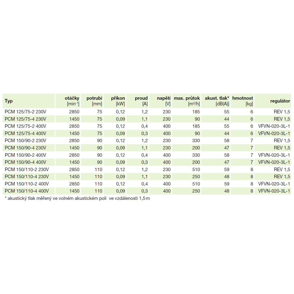 Hladina akustického tlaku vo vzdialenosti 1,5 m vo voľnom zvukovom poli je uvedená v tabuľke.