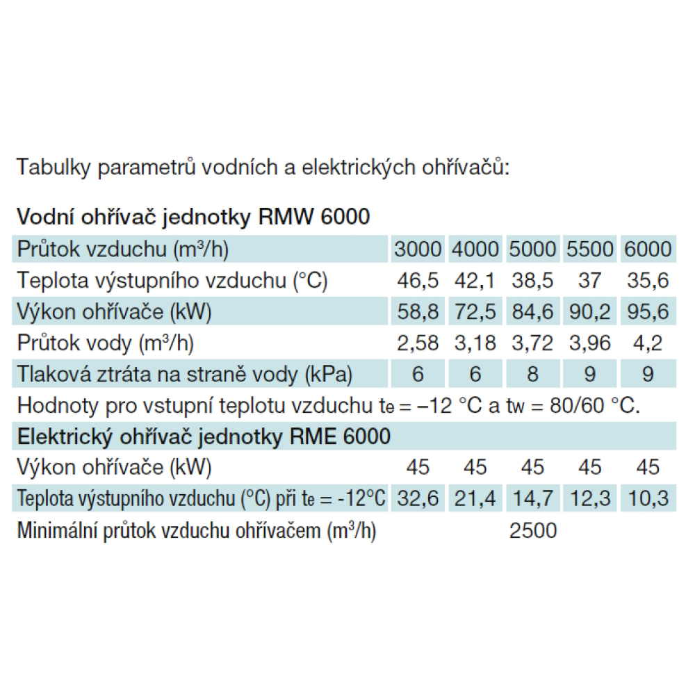 Ohrievače sú navrhnuté pre teplotný spád vykurovacej vody dT = 20 K (80/60 °C) pri teplote vstupného vzduchu te = -12 °C/90 % r.v. pri menovitom prietoku vzduchu. Elektrické ohrievače sú navrhnuté na teplotu vstupného vzduchu te = -12 °C/90 % r.v. pri menovitom prietoku vzduchu a sú vybavené prevádzkovým a havarijným termostatom.
