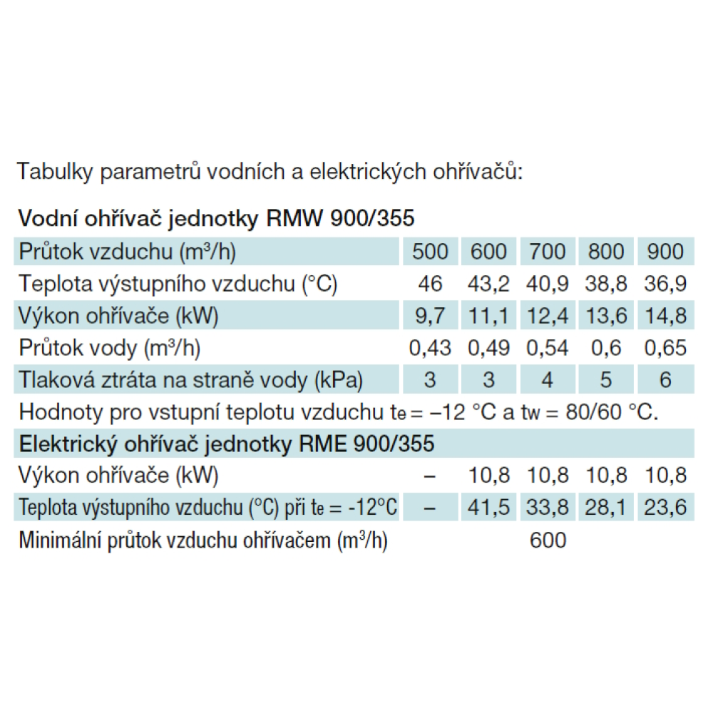 Ohrievače sú navrhnuté pre teplotný spád vykurovacej vody dT = 20 K (80/60 °C) pri teplote vstupného vzduchu te = -12 °C/90 % r.v. pri menovitom prietoku vzduchu. Elektrické ohrievače sú navrhnuté na teplotu vstupného vzduchu te = -12 °C/90 % r.v. pri menovitom prietoku vzduchu a sú vybavené prevádzkovým a havarijným termostatom.