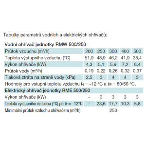 Ohrievače sú navrhnuté pre teplotný spád vykurovacej vody dT = 20 K (80/60 °C) pri teplote vstupného vzduchu te = -12 °C/90 % r.v. pri menovitom prietoku vzduchu. Elektrické ohrievače sú navrhnuté na teplotu vstupného vzduchu te = -12 °C/90 % r.v. pri menovitom prietoku vzduchu a sú vybavené prevádzkovým a havarijným termostatom.