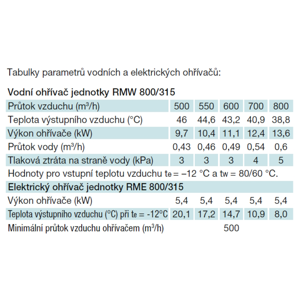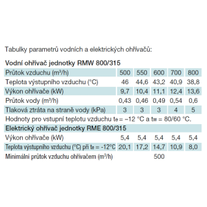 Ohrievače sú navrhnuté pre teplotný spád vykurovacej vody dT = 20 K (80/60 °C) pri teplote vstupného vzduchu te = -12 °C/90 % r.v. pri menovitom prietoku vzduchu. Elektrické ohrievače sú navrhnuté na teplotu vstupného vzduchu te = -12 °C/90 % r.v. pri menovitom prietoku vzduchu a sú vybavené prevádzkovým a havarijným termostatom.