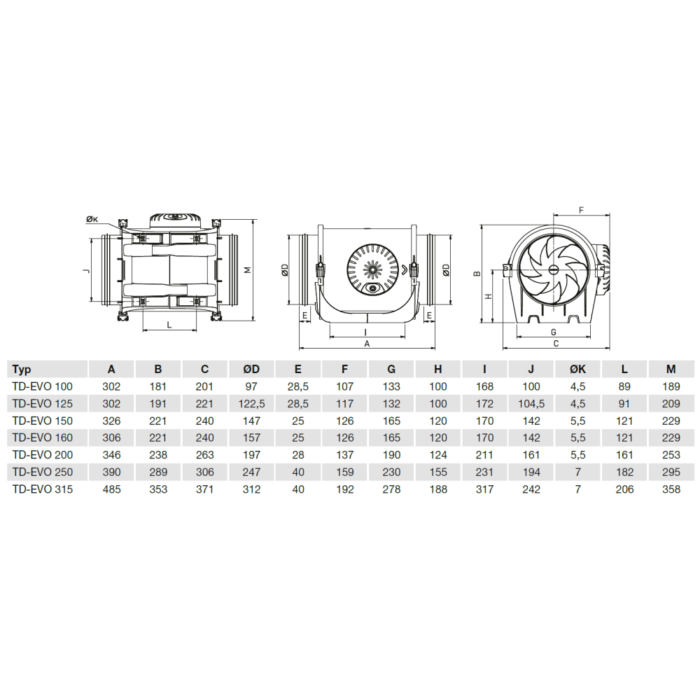 Motory na striedavý prúd vo ventilátoroch TD-EVO 125 až TD-EVO 315 majú trojité vinutie, čo umožňuje prevádzku s tromi rýchlosťami. Ventilátory TD-EVO VAR majú integrovaný triakový regulátor, ktorý umožňuje plynulú zmenu výkonu podľa nastavenia potenciometra v svorkovnici ventilátora alebo analógového vstupu 0-10 V. Motory sú vybavené tepelnou ochranou. Ložiská sú guľôčkové s tukovým tesnením na celú životnosť. Izolačná trieda F, stupeň krytia IP44. Napájacie napätie 230 V, 50/60 Hz.