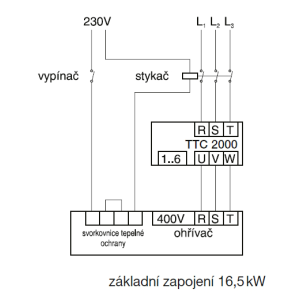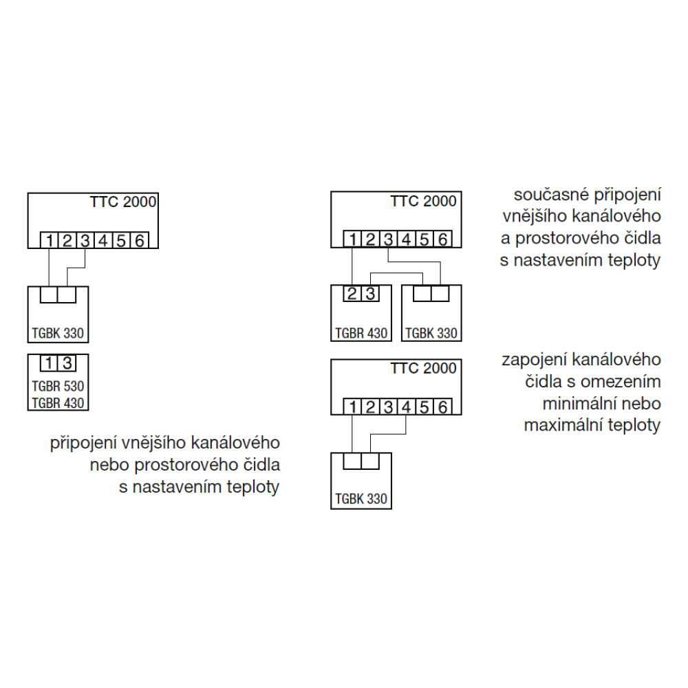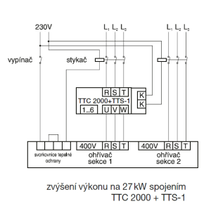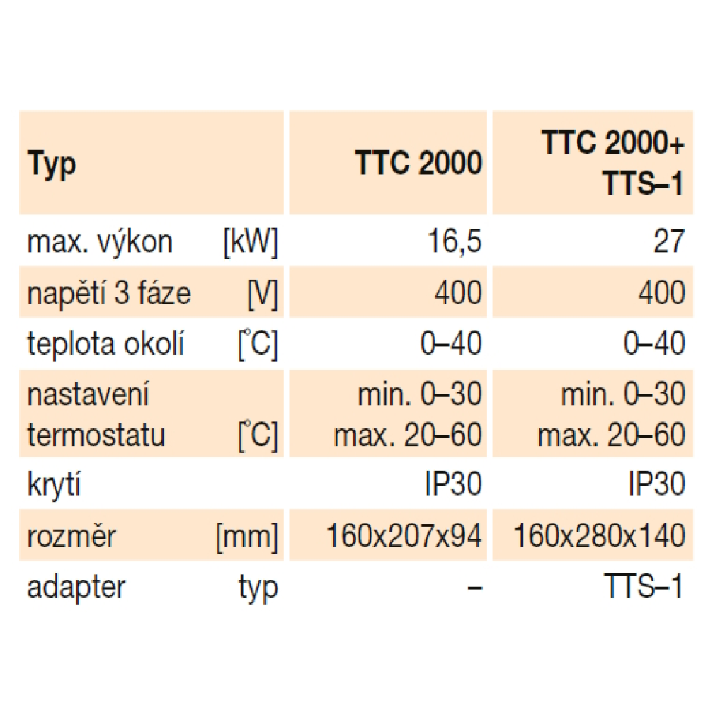 Triakový regulátor elektrického ohrievača TTC 2000 je určený na plynulé riadenie elektrických ohrievačov do 16,5 kW. V spojení s adaptérom TTS-1 je určený na reguláciu do 27 kW v dvoch stupňoch - trvalá 16,5 kW, pevná 13,5 kW. K regulátoru je potrebné pripojiť externý snímač teploty, napr. snímač TGBK 330 alebo TGBR 430, TGBR 530. Je možné pripojiť aj druhý snímač na obmedzenie teploty (max. alebo min.), časový spínač na prepnutie na nočný pokles (rozdiel 4 °C), prepojený druhý regulátor alebo pripojiť externý riadiaci signál 0-10 V.