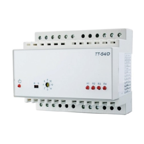 TT-S4/D je modul rozširujúci kapacitu TTC40F o 4 výstupy na ovládanie až 4 vykurovacích sekcií (4 výstupy na spínanie 4 stykačov, ktoré fyzicky spínajú vykurovaciu sekciu). Ovládanie môže byť sekvenčné alebo binárne. Inštalácia na DIN lištu v rozvádzači. Krytie IP20.