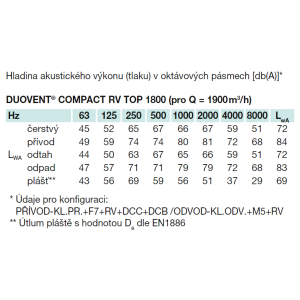Hlukové hodnoty uvedené v tabuľkách predstavujú hladiny akustického výkonu na jednotlivých hrdlách jednotky s korekciou váhového filtra A, hladinu akustického výkonu celého plášťa jednotky. Akustické parametre sú v rozmedzí ±3 dB.