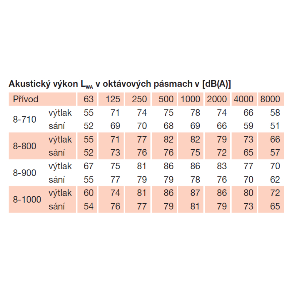 emitovaný ventilátorom je uvedený v tabuľkách ako hodnoty akustického tlaku vo vzdialenosti 1,5 m, merané vo voľnom akustickom poli.