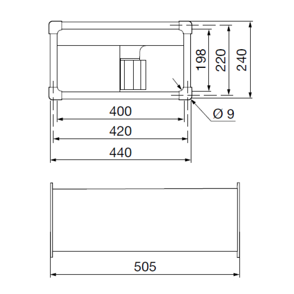 je vyrobená z pozinkovaného plechu a je vybavená prírubami na montáž na štvorcové potrubie. Skriňa má kontrolný kryt, ktorý po odstránení umožňuje prístup k motoru a obežnému kolesu.