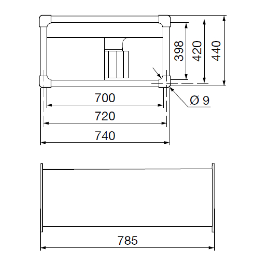je vyrobená z pozinkovaného plechu a je vybavená prírubami na montáž na štvorcové potrubie. Skriňa má kontrolný kryt, ktorý po odstránení umožňuje prístup k motoru a obežnému kolesu.