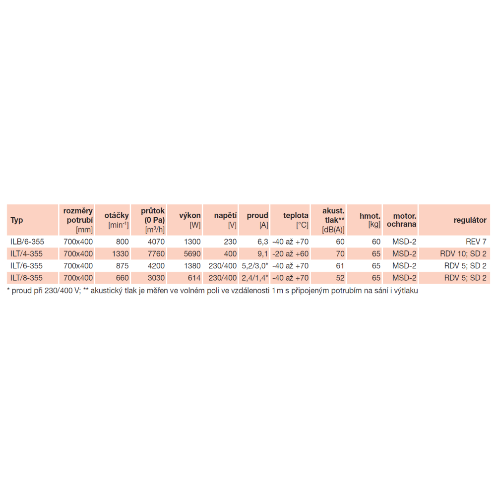 je asynchrónny s odporovým kotvom. Motory ventilátorov ILB sú jednofázové pre 230 V, motory ILT sú trojfázové pre 230/400 V alebo 400 V. Motory sú štandardne vybavené tepelnou poistkou, izoláciou triedy F, prevádzková teplota podľa typu. Utesnené guľôčkové ložiská sú mazaná na celý život. Krytí IP55.