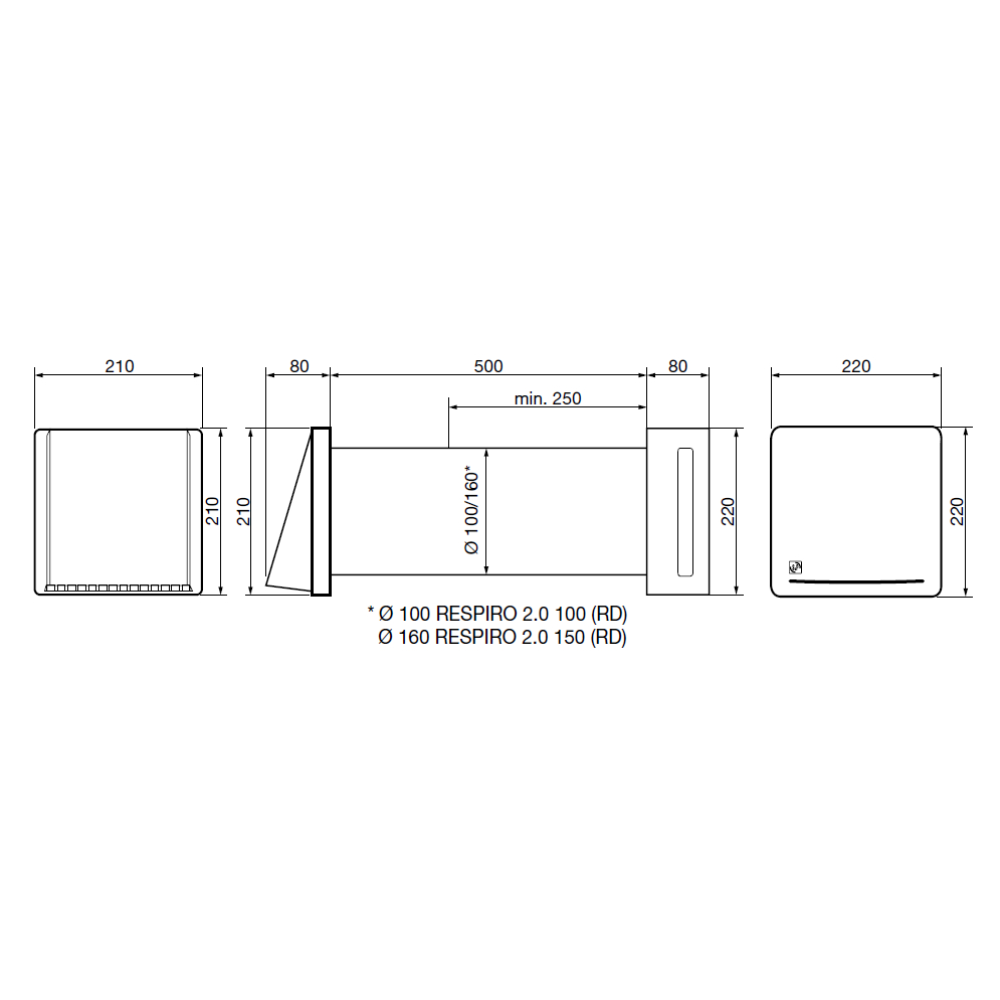 je vyrobená z odolného tvrdeného plastu bielej farby. Časť jednotky, ktorá obsahuje výmenník tepla, umožňuje inštaláciu do steny s hrúbkou 250–500 mm. V prípade väčšej hrúbky steny je možné ako voliteľné príslušenstvo dodať predĺženie s dĺžkou 700 mm pre jednotku RESPIRO 2.0 150 (RD) alebo pomocou vonkajšej spojky (SN 100) pripojiť predĺženie s dĺžkou 500 mm k existujúcej trúbke pri jednotke RESPIRO 2.0 100 (RD). Vnútorná časť jednotky je vybavená dizajnovým čelným krytom.