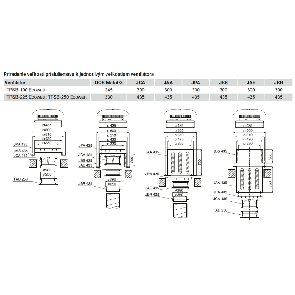 Strešné ventilátory TPSB Ecowatt sa montujú montážnou základňou na vodorovné strešné konštrukcie alebo stavebne pripravené murované sokle. Ďalej je možné použiť sokle JMS a JBS.