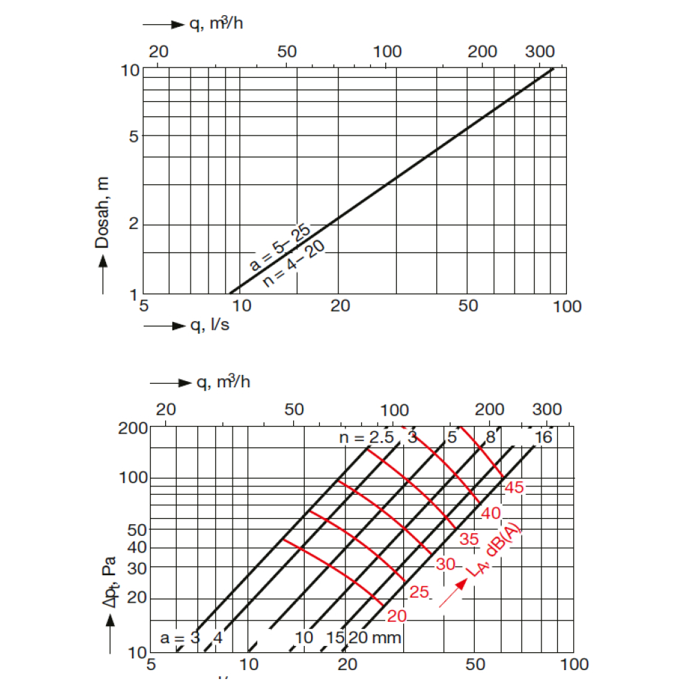 Regulácia prietoku vzduchu sa vykonáva otáčaním stredového kotúča, čím sa mení otvorenie ventilu "a" (mm). Meranie prietoku vzduchu sa vykonáva ako meranie tlakového rozdielu pomocou meracej trubice. Podrobnejšie informácie nájdete na schémach.